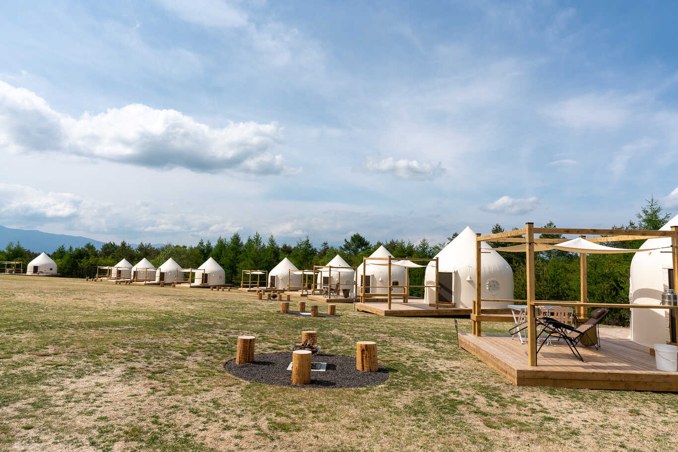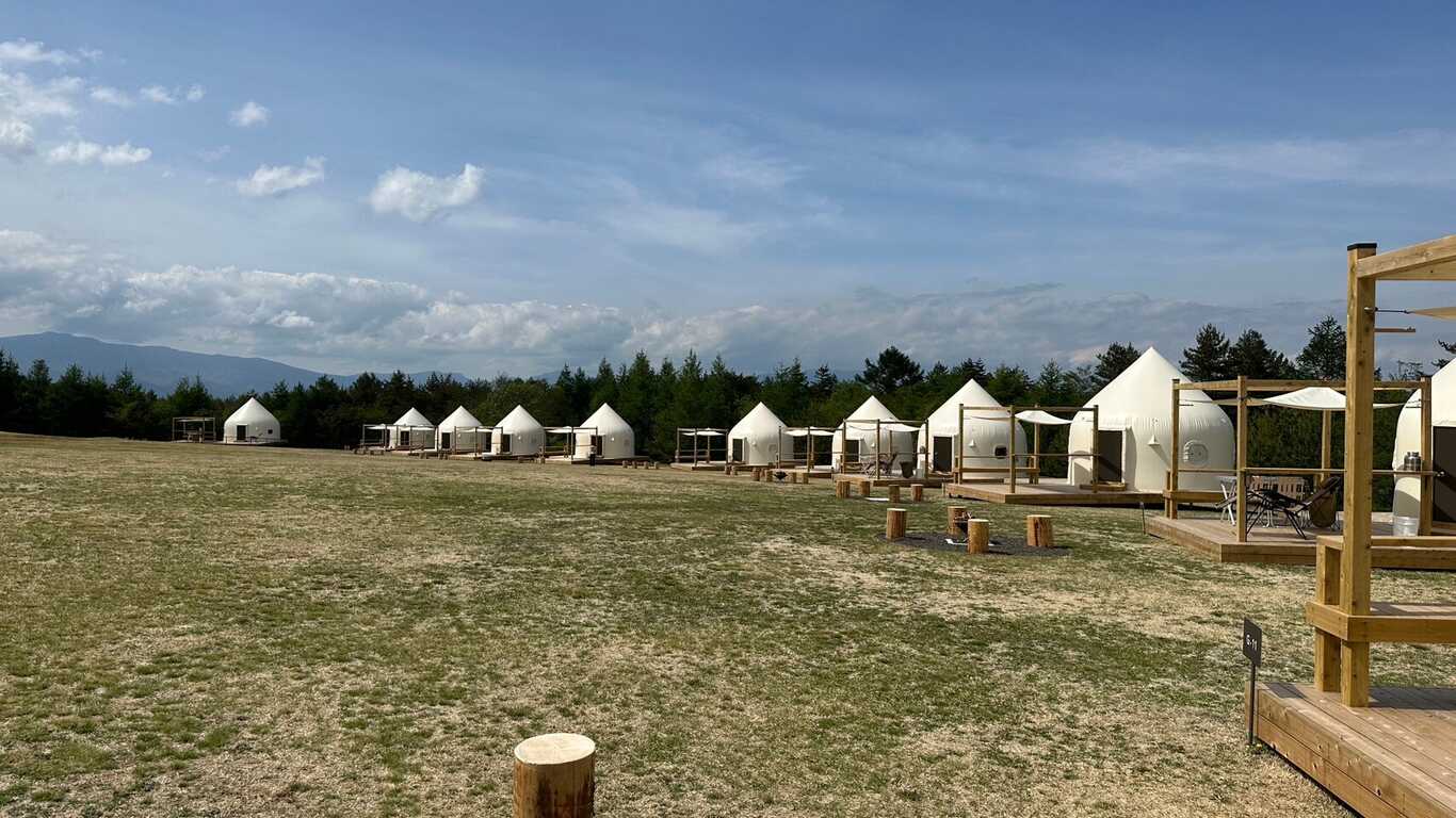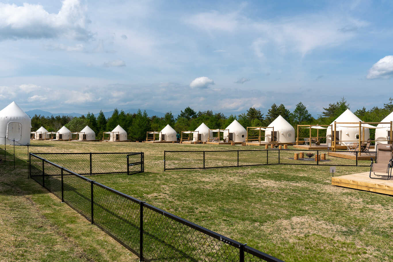 とんがり屋根でマシュマロのような外観の「ジオルームグランピング」が浅間山キャンプ場の特徴です。