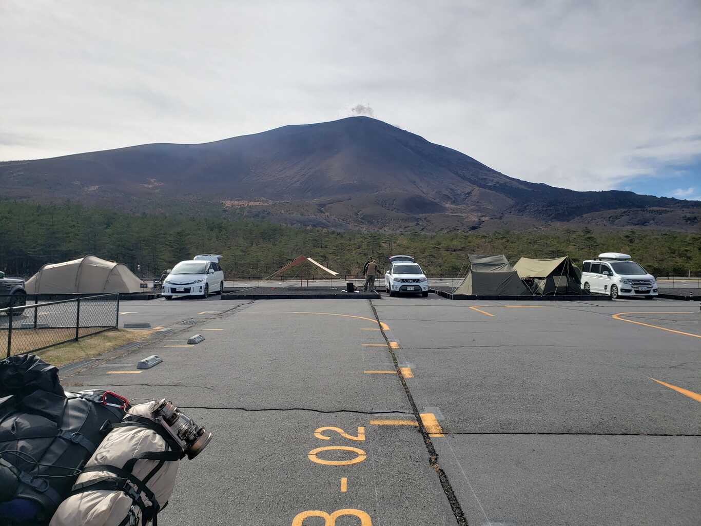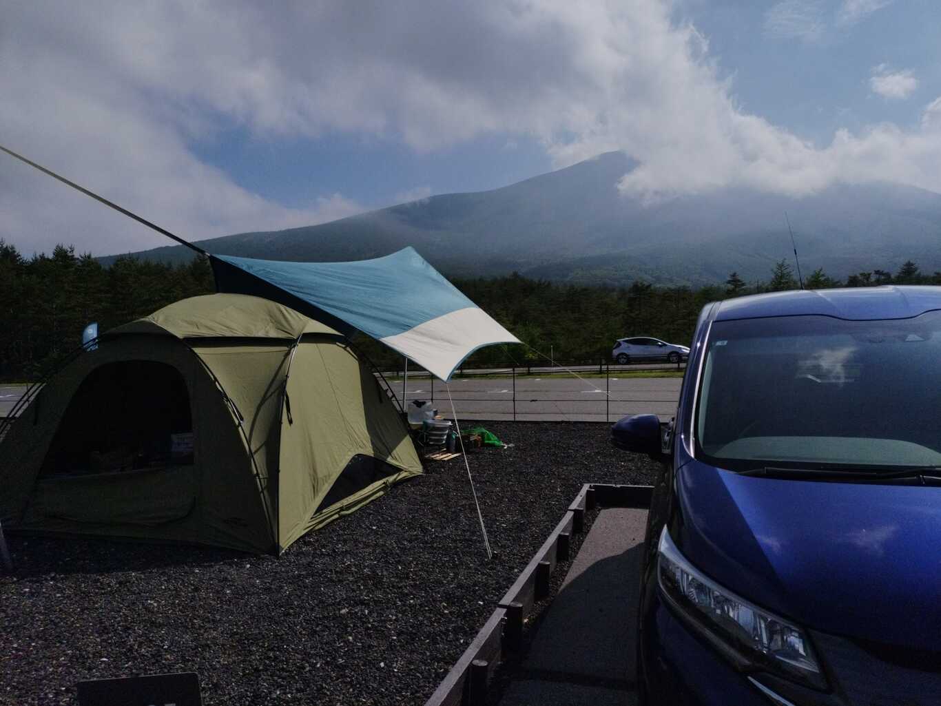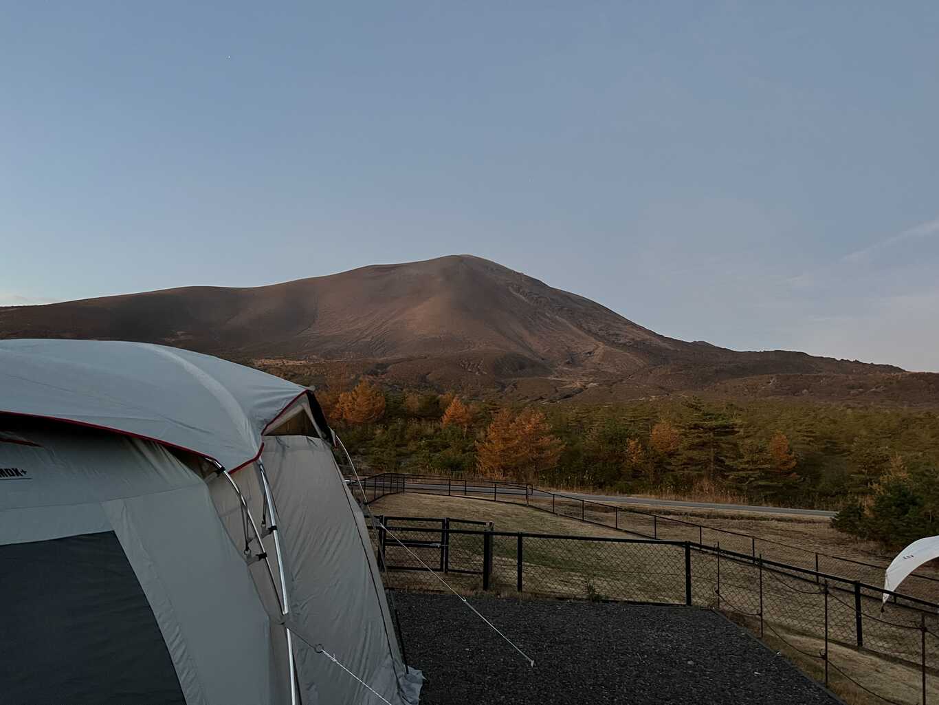 浅間山を背景に壮大なシチュエーションでした。 砂利サイトでペグが抜けやすいのが少し大変でした。