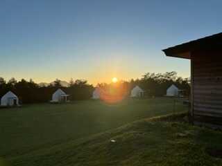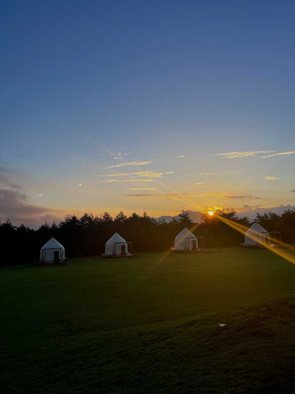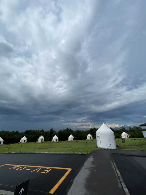 ジオグランピングを利用しましたが、ジオルーム前は広い芝でとても気持ちが良かったです。 初日は夕方まで豪雨でしたが、夜は雨風が雲も全部流してくれたおかげで満天の星空!プラネタリウムの中にいるようで今までキャンプや星空鑑賞で有名なところも含め見た夜空の中で1番綺麗でした。 朝は5:00頃に起きたら朝焼け→日の出が非常に綺麗でした。更に、日の出と反対側を見ると日の出でピンクに染まる浅間山が圧巻でした。 9月中旬でしたが日中はカラッとしてて日が照ると直射日光が結構暑く半袖でちょうどよく、夜は肌寒く一枚羽織るものが必要、朝はライトダウンやフリースや膝掛けがちょうど良いくらいでした。寒暖の差が結構あります。 虫はいますが蚊はいませんでした。トンボがいっぱい飛んでいました。