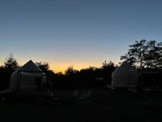 オートサイトのドッグランサイトをグループで利用しました。雄大な浅間山を目の前に眺めながらゆったりとした時間を過ごせました。夜は満月だったため、満点の星空とまではいきませんでしたが、夜中に起きた時は星空が広がっていました。キャンプ場の標高は1400メートルに位置しているため、日中は30℃近く気温が上昇しても、夜は20℃を下回り防寒着は必須でした。 早朝は朝焼けに染まった赤い浅間山とキャンプ場の木立の隙間から雲海も見ることができ、大自然を満喫することができました。