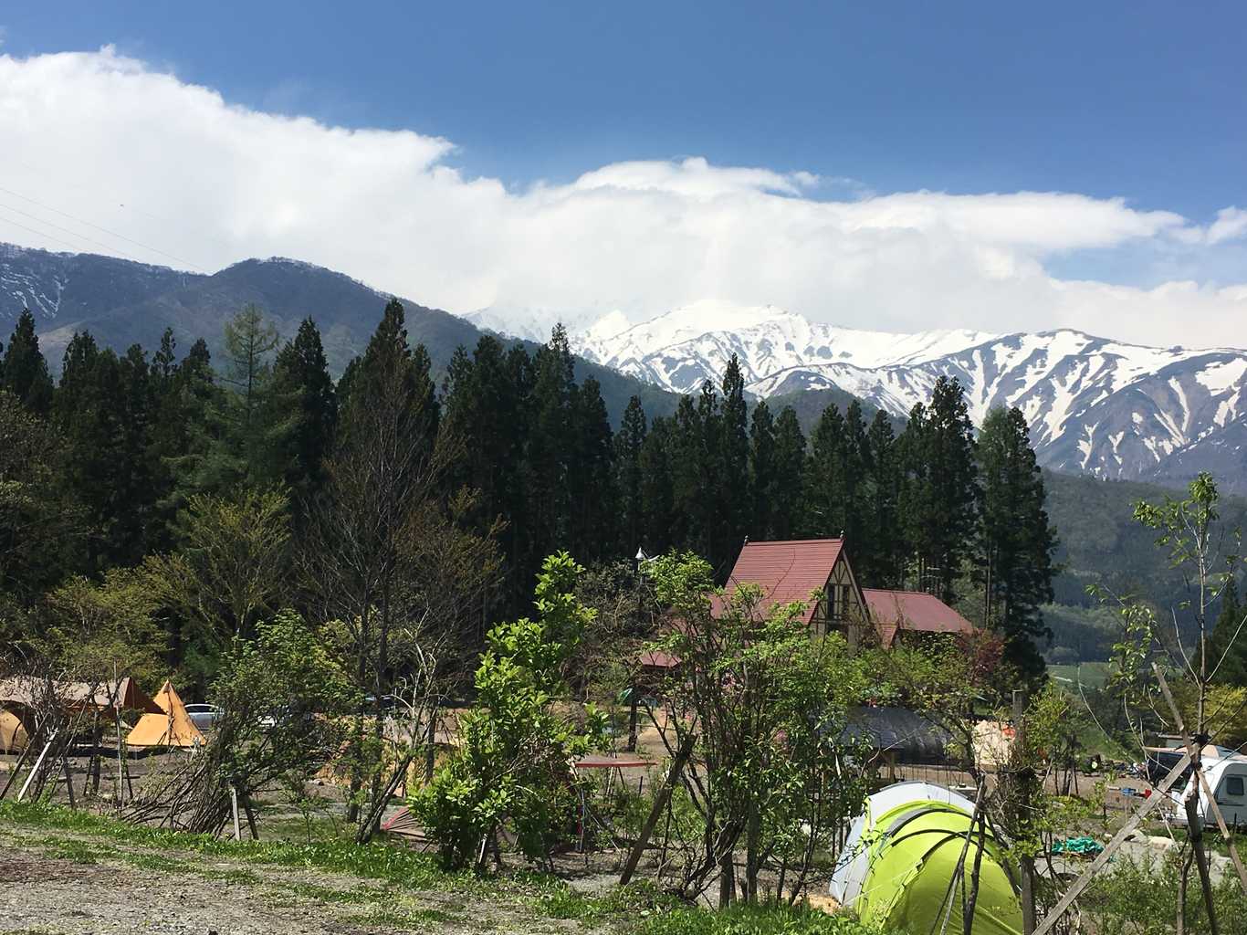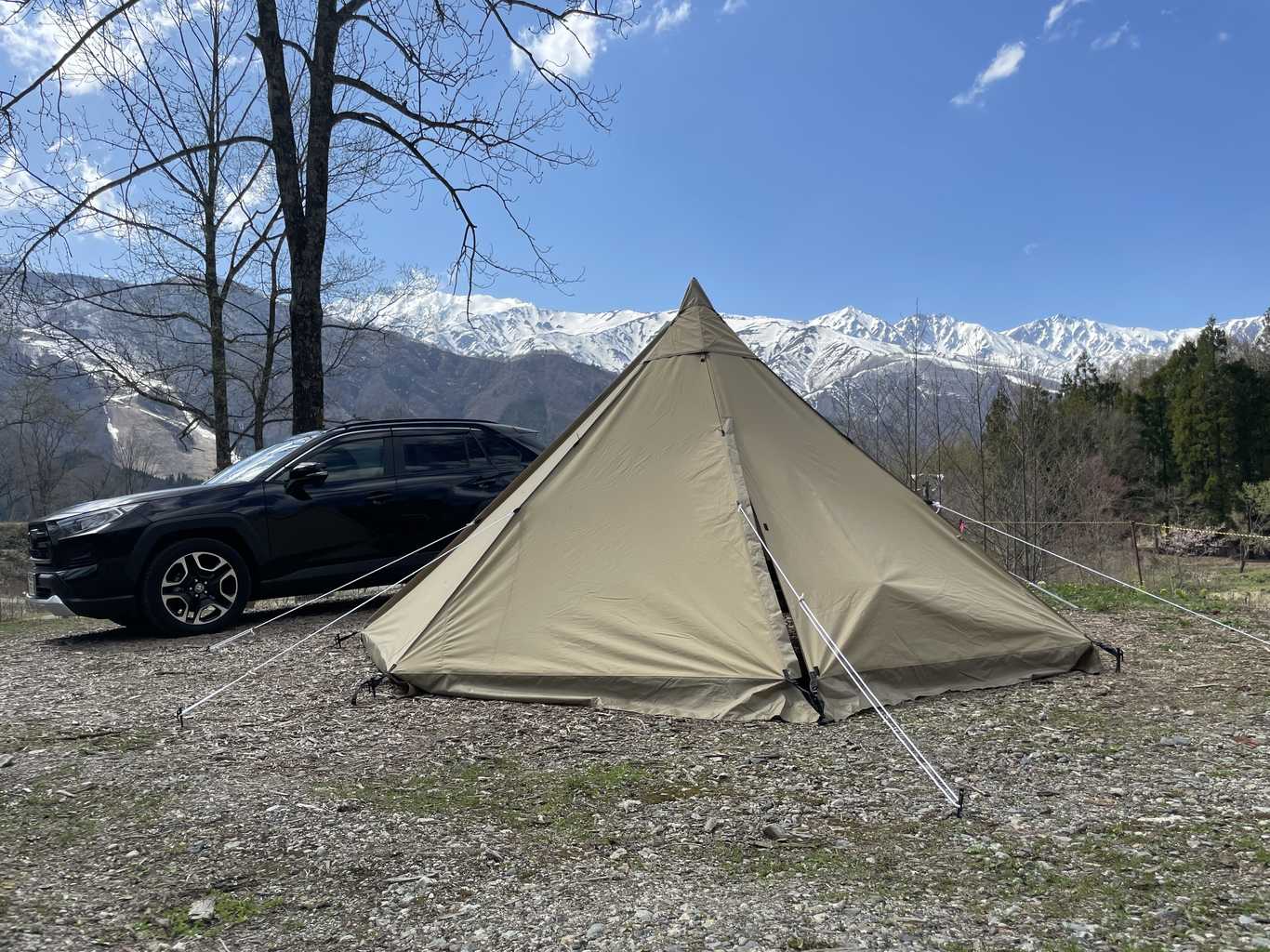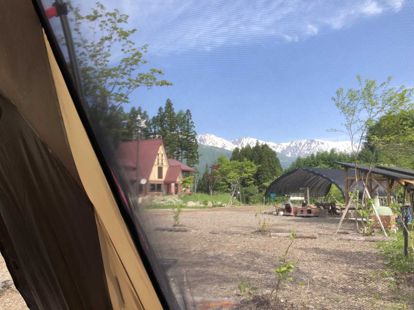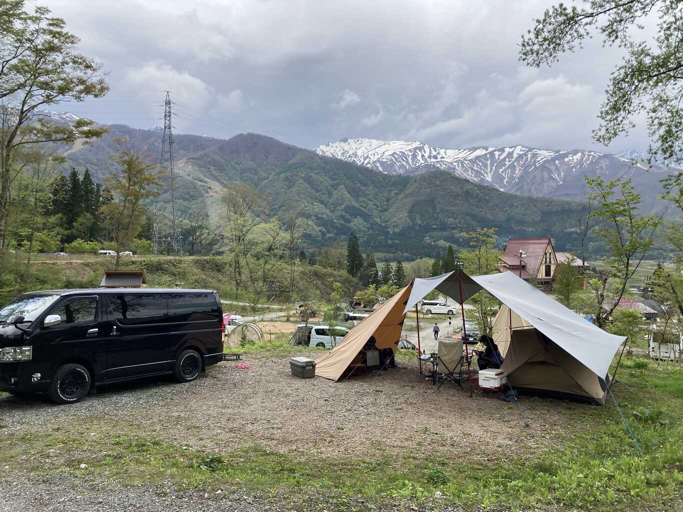 キャンプ場から見える残雪の山々が迫ってくる景色は、非常に素晴らしいです。 テントサイトについても、サイト同士がある程度離れているので、プライベート感は、まあまあです。