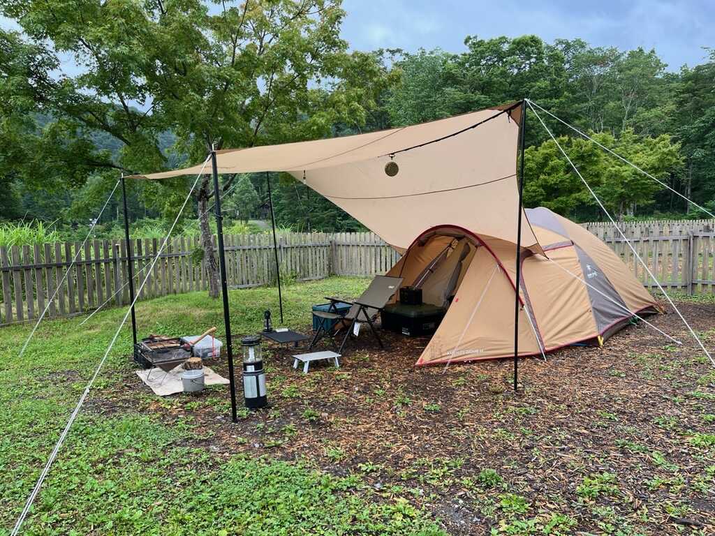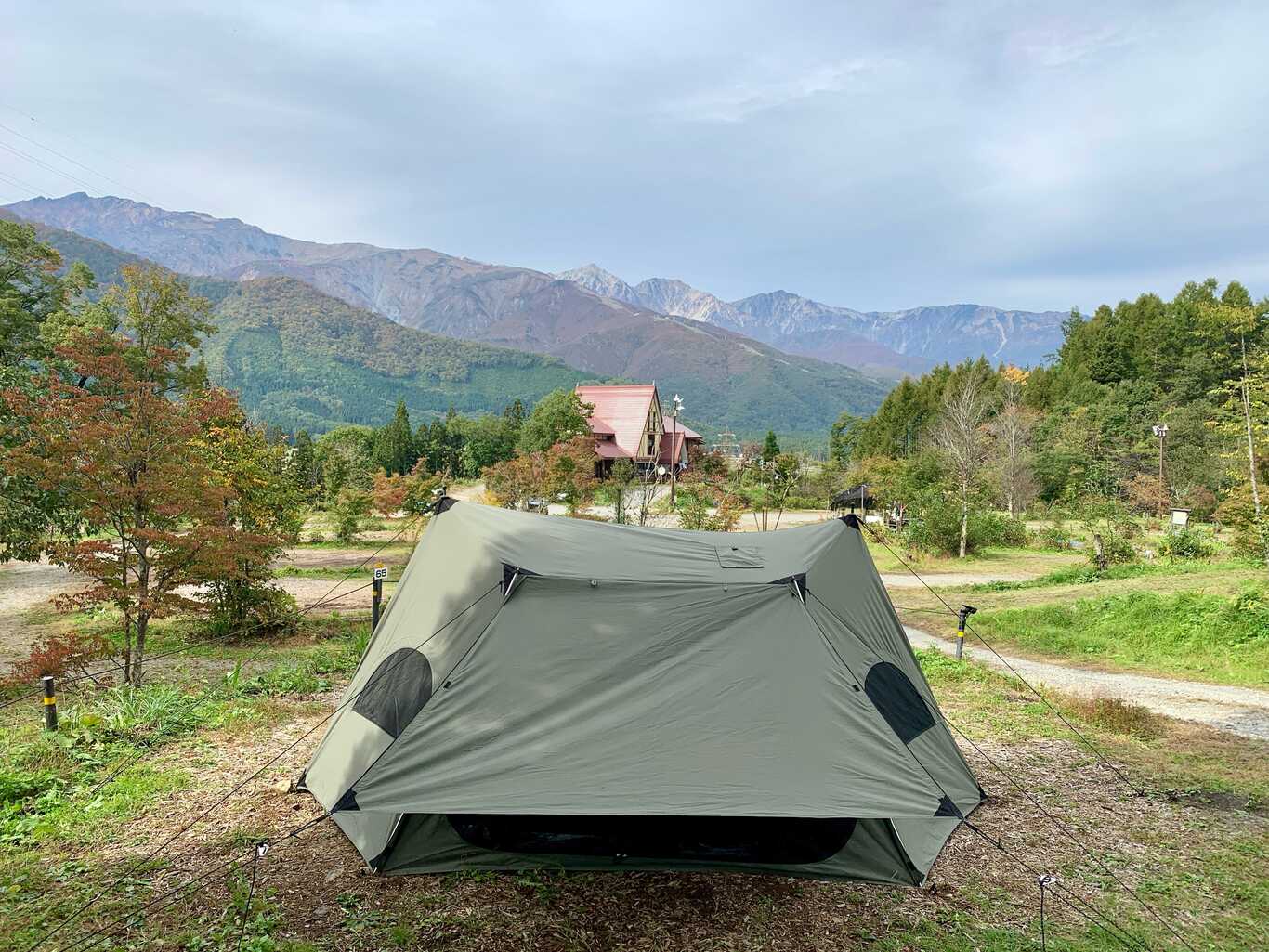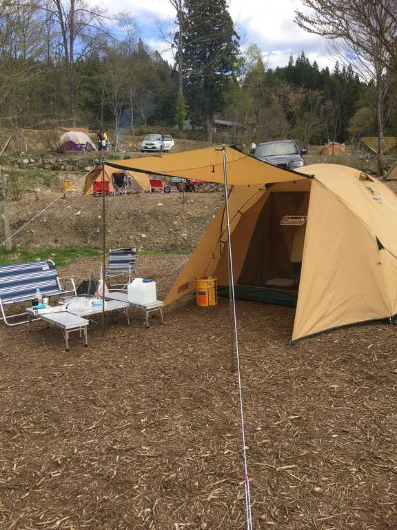 白馬の山の景色が広がる中、ウッドチップで整備された地面でキャンプできました。ウッドチップなので、グランドシートが汚れにくいため、撤収後が楽でした。