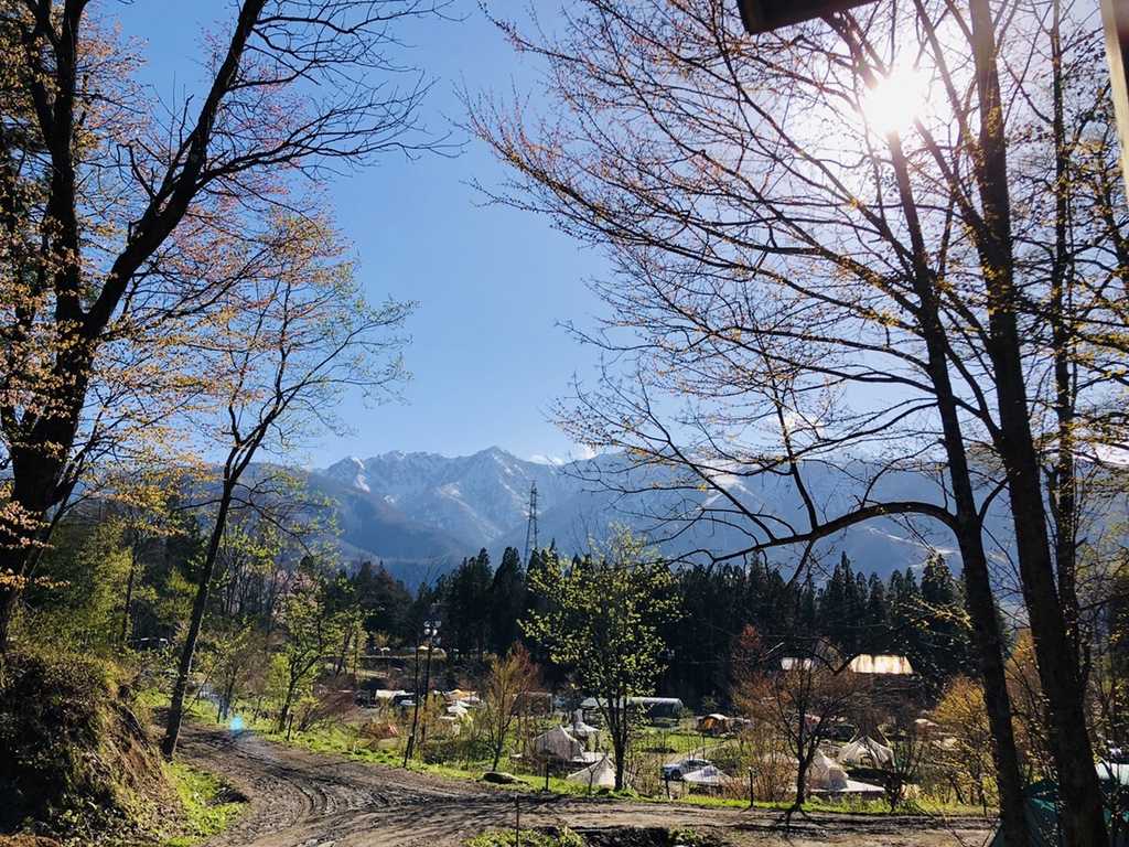 自然の中のキャンプ場なので、とても気持ちがいいです。 キャンプ場からは雪景色の白馬の山々が見えて、 とても感動しました。 空気もすんでいて、夜にはとてもキレイな星空が見られます。