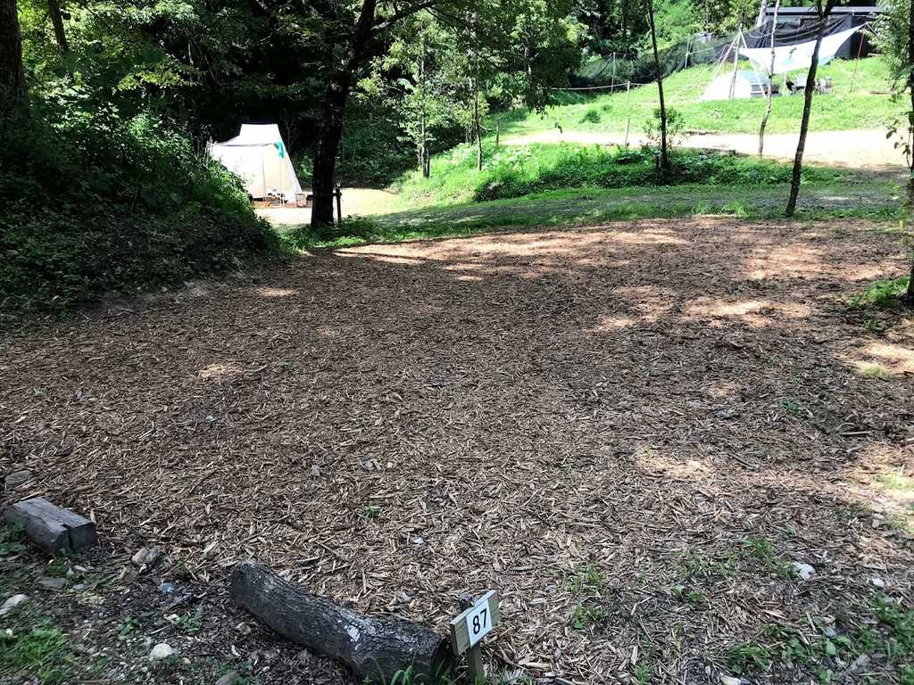 サイト地面は木屑が敷いてあり、テント下にマットが無くても、「石が当たって痛い」ということはなかったです。また、サイトによって個性があり、木陰が出来やすい/出来にくいサイト、木が真ん中に生えているサイト等々と、自分の好みのサイトを探すのも面白かったです。
