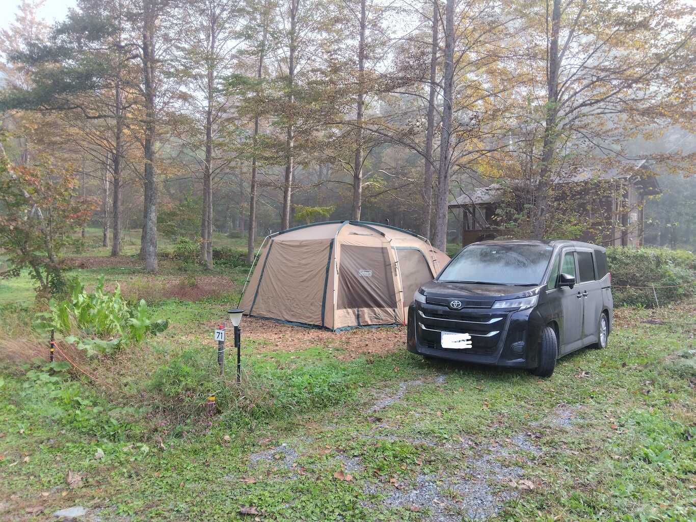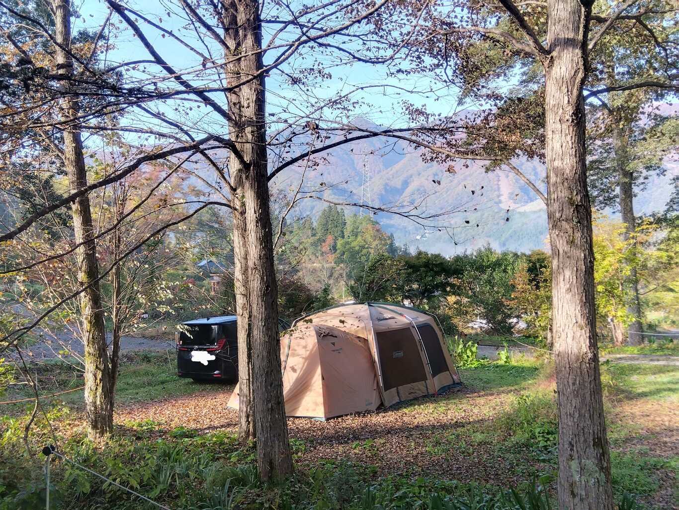 雨だったので周辺の山々と星空は見れませんでしたが、キャンプ場内の木がキレイに植わっていて紅葉が進めば最高な景色になるのが想像できました。