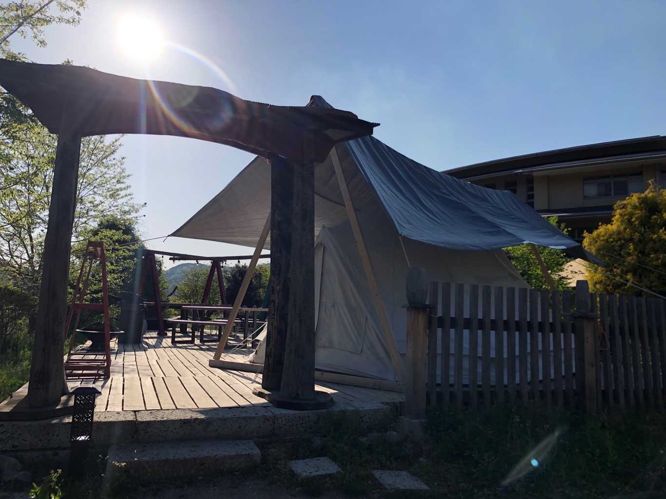 開放感あるウッドデッキ付のコットンテント等、憧れのグランピングテントに宿泊。