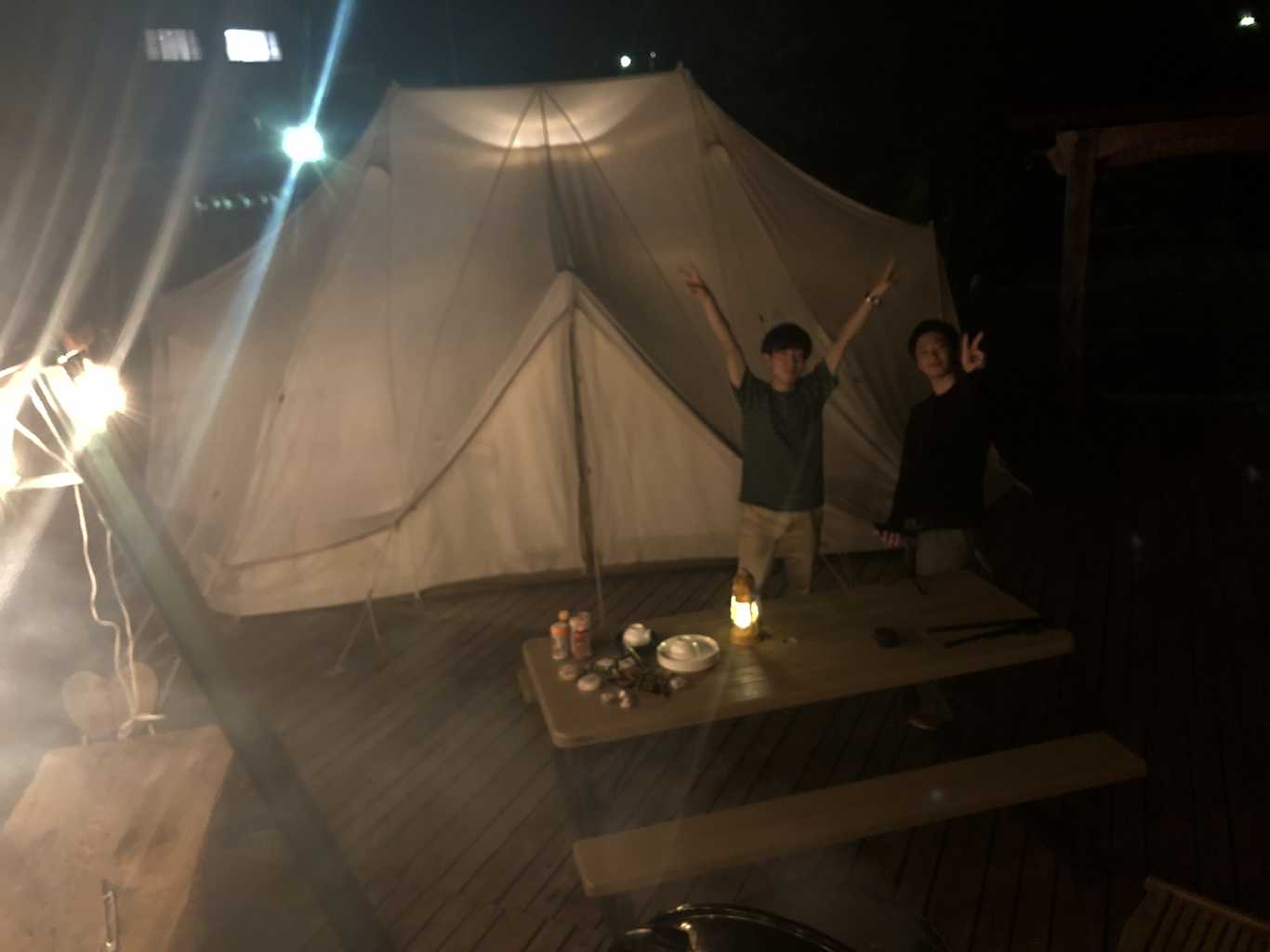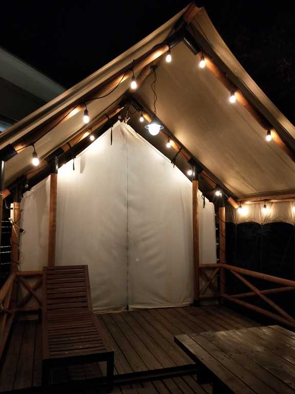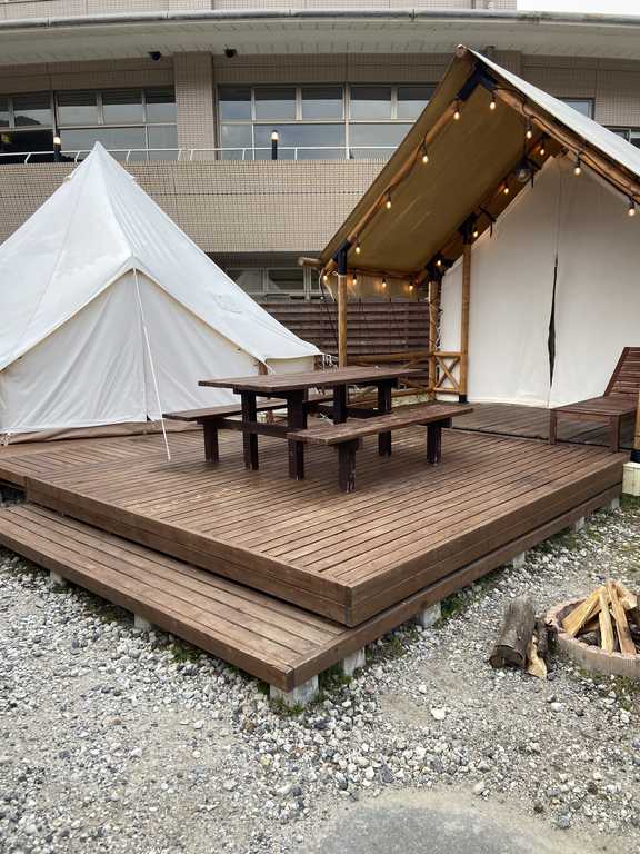 テントがとても綺麗! 備品の対応力が素晴らしい! →怪我や虫刺され様に 救急箱設置。ボードゲーム等。 外履き用の人数分のサンダル。 加湿器。大きめの冷蔵庫。 テント外に 焚き火があり、フロントに電話すると 直ぐに対応して下さる! 併設の温泉、プール等が 最高!! マンガコーナーや、室内で子供が遊べる場所あり、 大満足!! キャンプ用の売店はないので 忘れた場合は 困るかも…