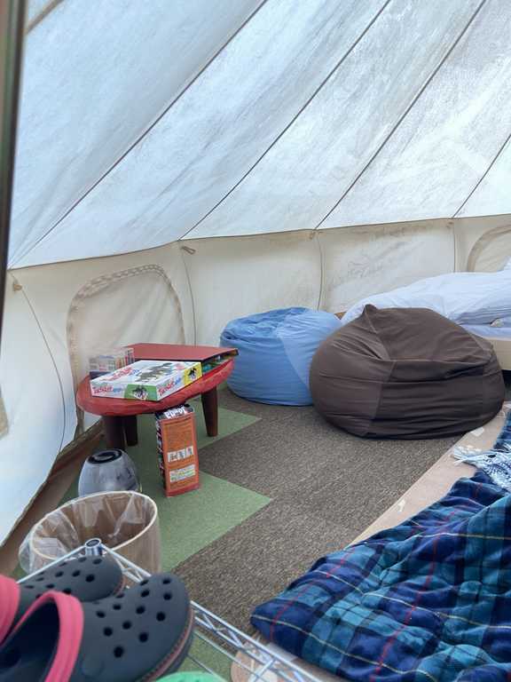 テント内は申し分なし。ジェンガや人生ゲームなど置いてあり楽しめました!! 温泉、プールの施設が近いので楽でした。