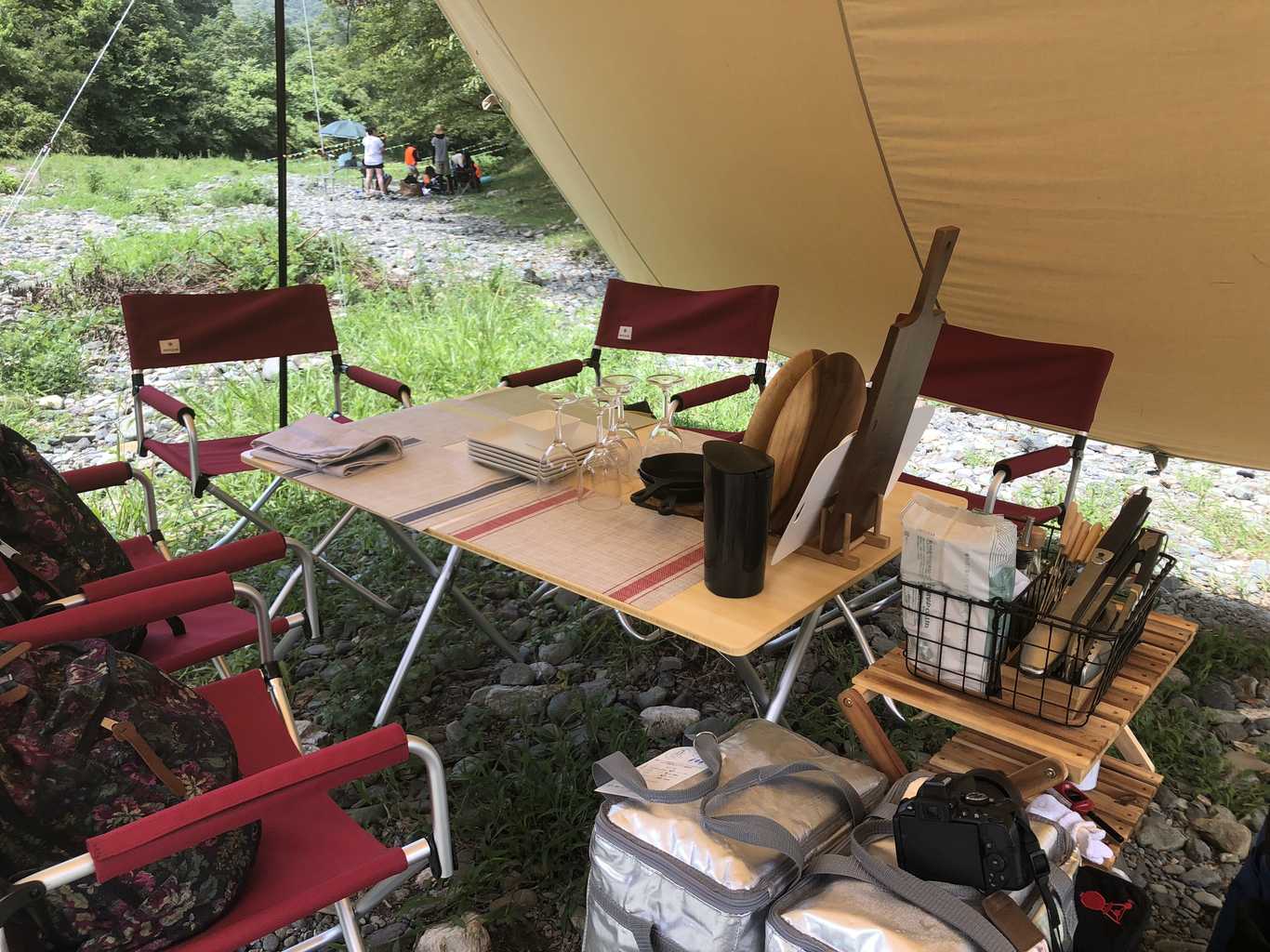 グランピングサイトAを利用しました。川が目の前にあり開放的な雰囲気がありますね。祝日だったので、地元の方達も川遊びに来ていて賑わっていました。
