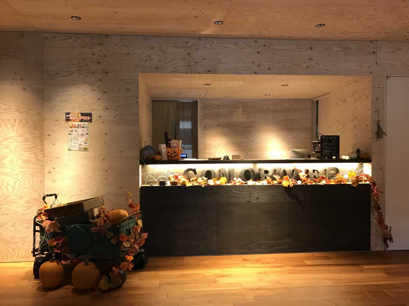 管理棟には薪ストーブやビリヤード台や書籍、木工造作コーナー等があり、子供も楽しめる施設になっている。更にドリンクが無料で提供され、施設内で焼いた焼き立てパンも目玉の一つ。クラフトビールやワイン等、アルコールも拘りのものが置いてある。