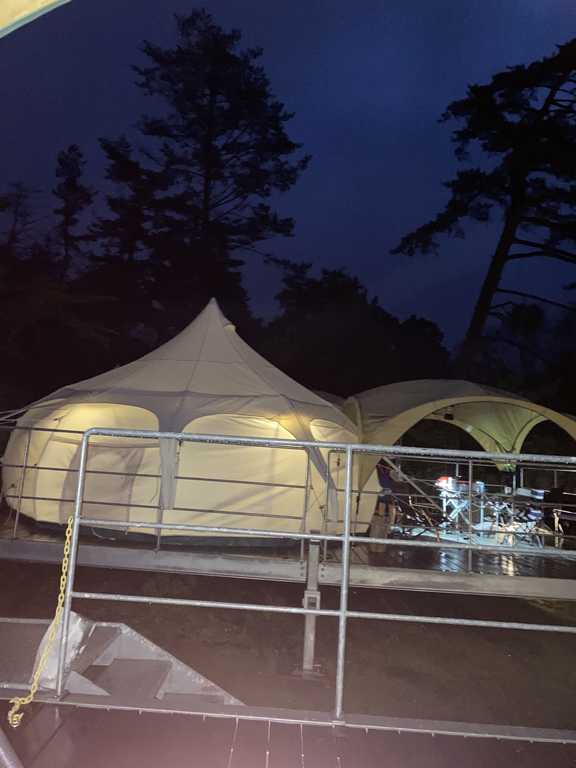 ・ツリーハウスは人が動くとにかく揺れます。まあ仕方ない思います。 中は割とに広くて快適そうな感じでした。 ・ドームテントの方も中は広く区画ごとにデッキもあり天気が良ければ快適そうでした。 備え付けの2段ベットは前後にぐらぐら動くので上下で寝るには厳しいそうです。 実際に床で寝たそうです。