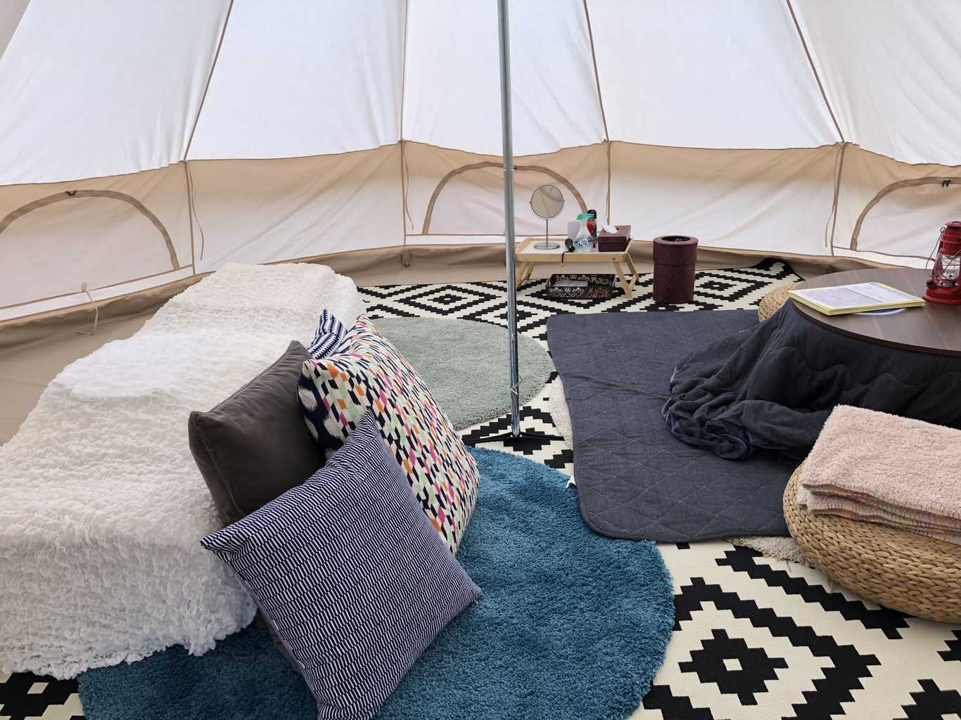 テント内も、おしゃれなカーペットやカフェテーブル、トレイテーブルやクッションなど充実したアイテムが用意されていますよ。